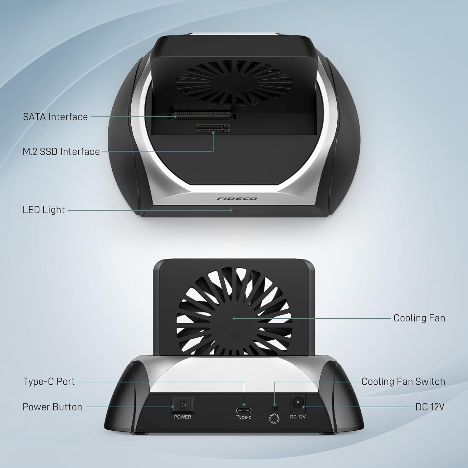 I have had pretty good luck with FIDECO products in the past so i thought this docking station would be good so i ordered it.Well it takes a 2.5 ssd ,3.5 Hdd and a M2 ssd and it seems to read them just fine but there is one problem that i didn't realize is it can't read both drives at the same time so basically it's a one drive docking station with a loud 80mm fan. i kept trying to get them both to work and at first i thought that the M2 ssd slot was messed up because the 2.5 ssd was reading fine so after messing with it for about half hour i decided to get on Amazon and see what the deal is why i can't get both drives to be recognized.I finally scrolled down the page for this FIDECO docking station and i find this, (Warm Note: Any 2 hard drives cannot be used simultaneously) So thats what i was looking for but not what i wanted to see. If i would have known this I wouldn't have ordered it because i have never seen one work this way.Now i like the idea of the 80mm fan because i had one real simuliar to this but it quit working and i think the reason it did is because it got to hot. This fan works just fine but be ready for some noise i finally shut it off because i have a stand i made that has two 120mm fans for underneath two docking stations.Overall i'm not to impressed with this docking station if your fine with having to change your drives everytime you want to use one then thats your choice, myself i think all just put my M2 NVME ssd in it and thats how it will be a single M2 ssd docking station end of story.It's usally not like me to complain about products i review but this docking staion just didn't meet the expectations I was hoping for but it is partly my fault for not reading everything before hand. Hope maybe this might help some some of you .Thanks For Reading