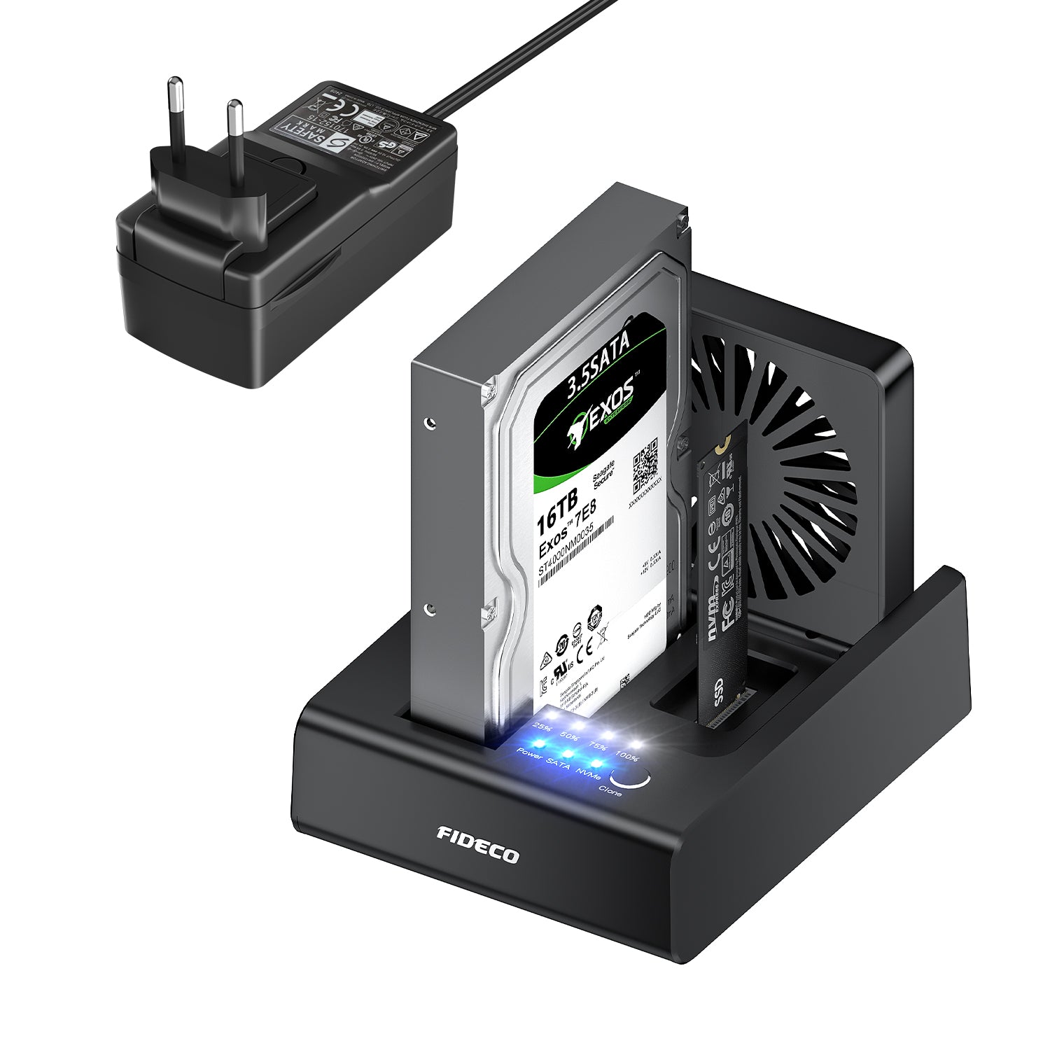 FIDECO HDD/SSD Clone Docking Station with Cooling Fan, support SATA HDD/SSD, M.2 NVMe SSD