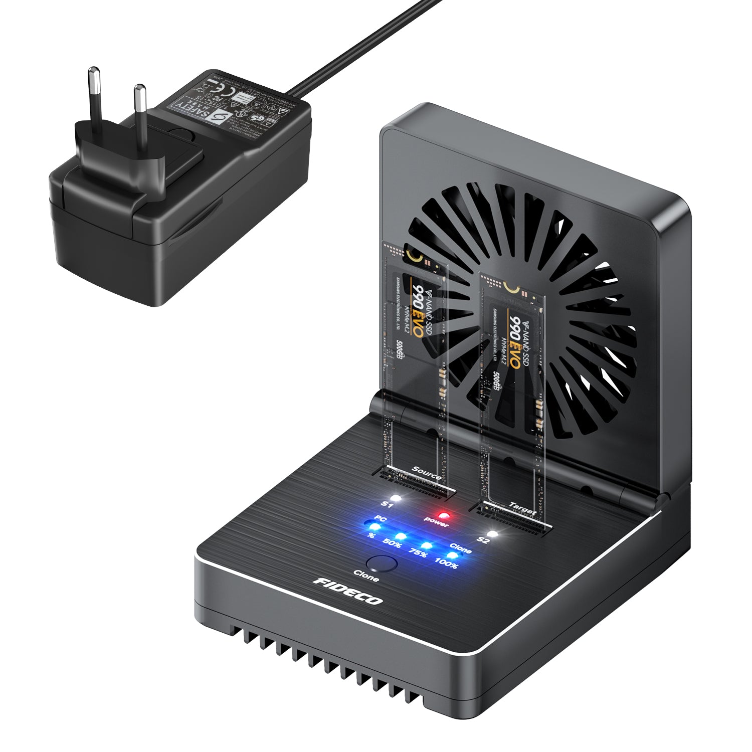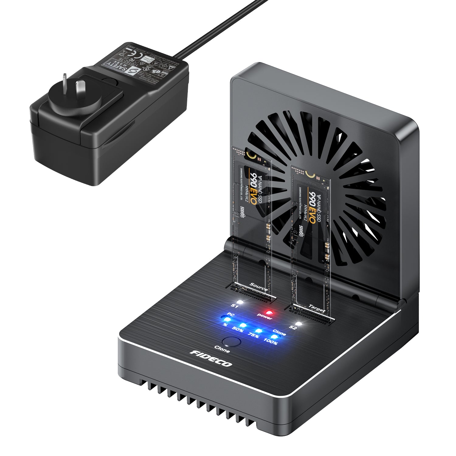 2. Open the fan and plug the source M2.NVME SSD in Slot A and the target M2.NVME SSD in Slot B.