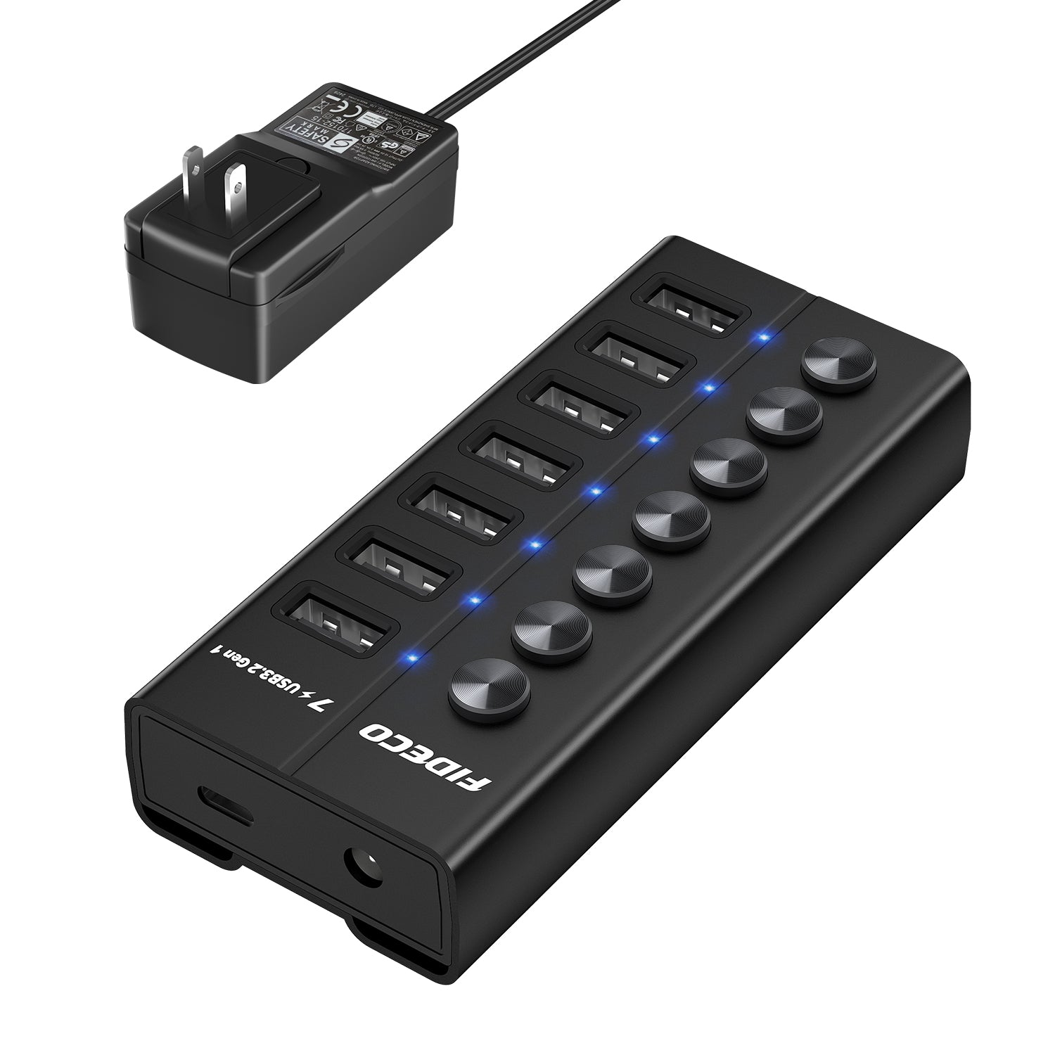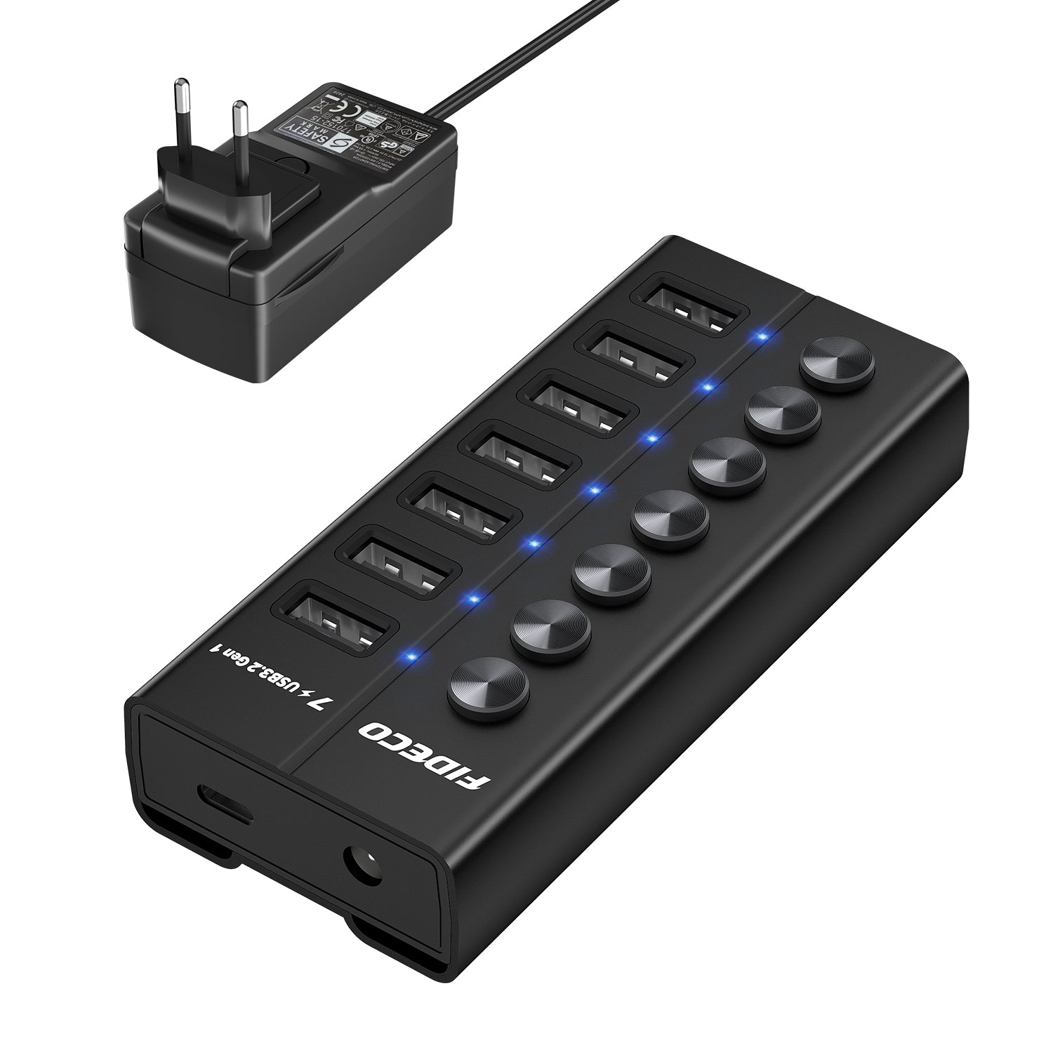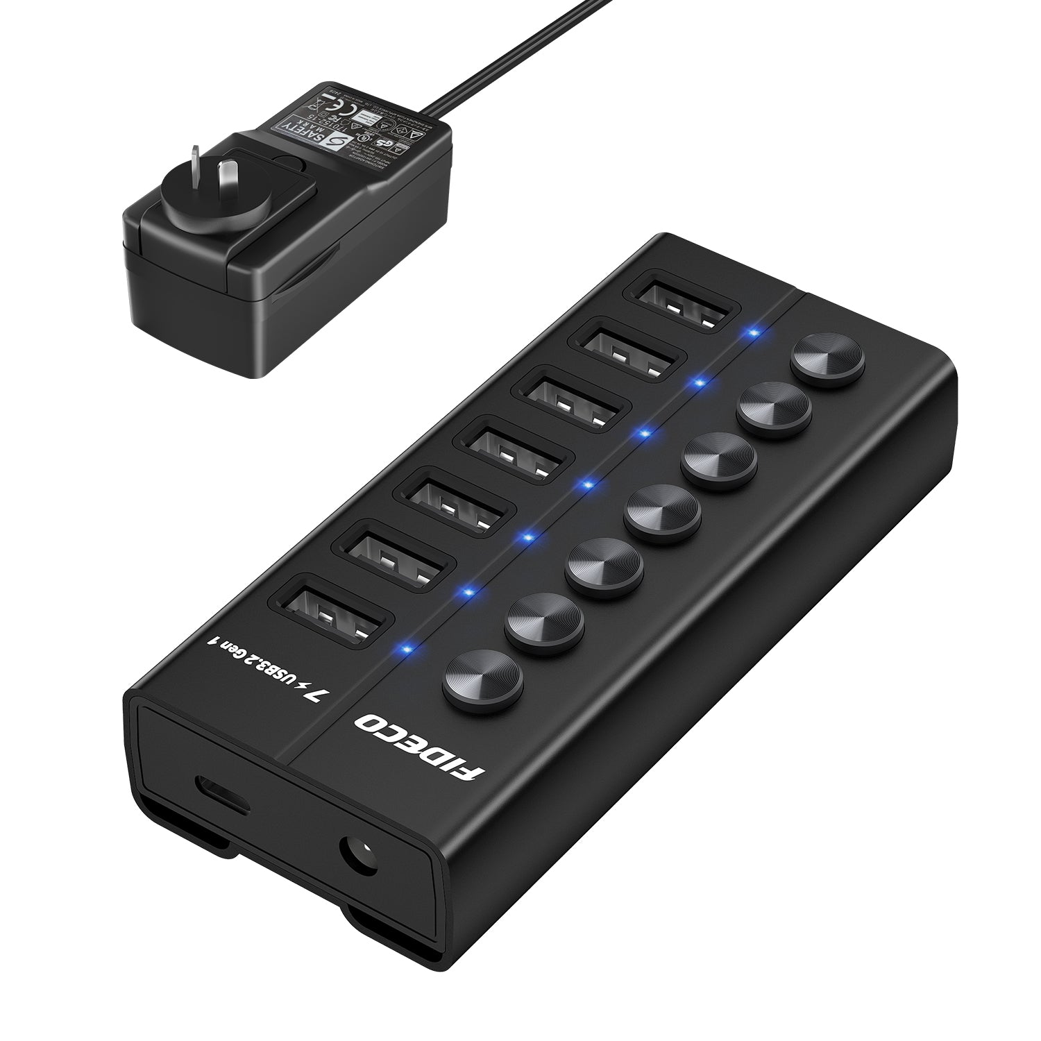 FIDECO USB splitter is equipped with 12V/2A power adapter, and can support simultaneous connection of total 7 devices.