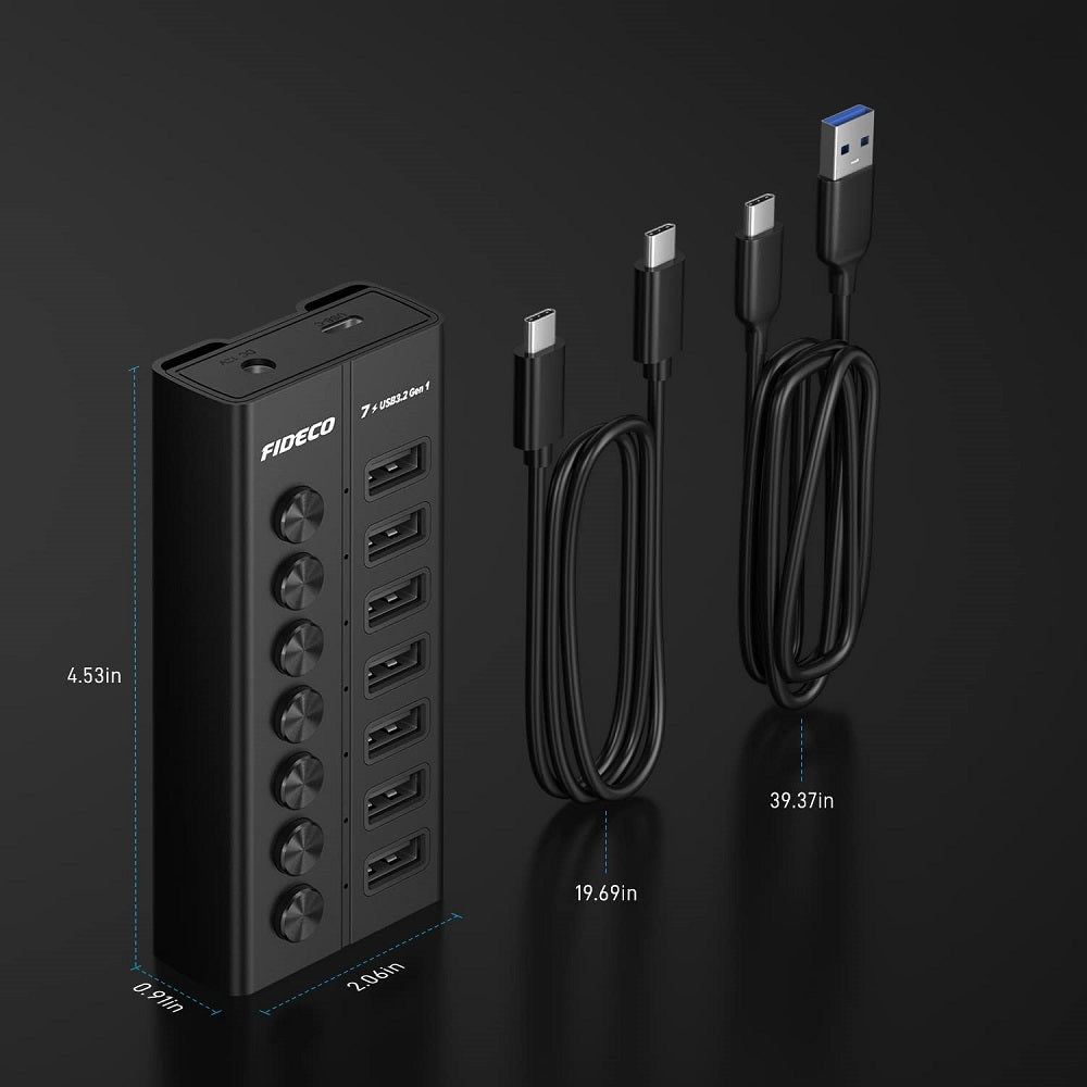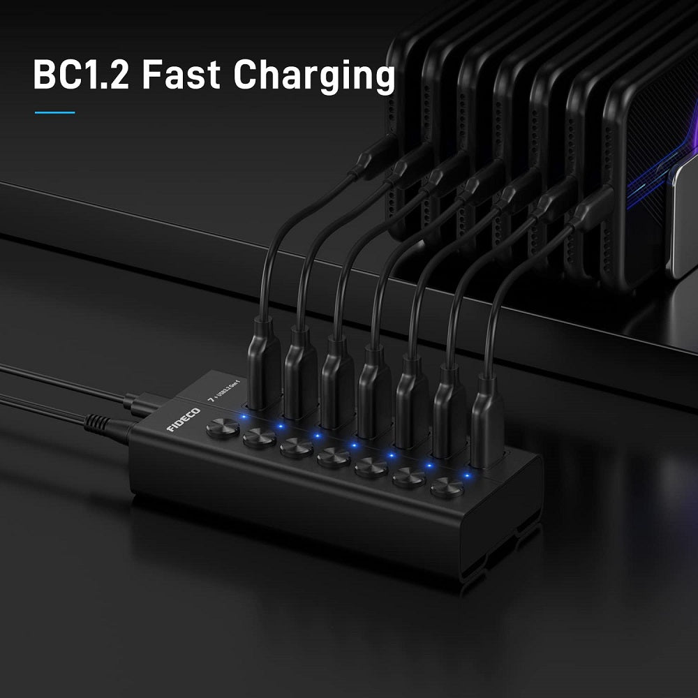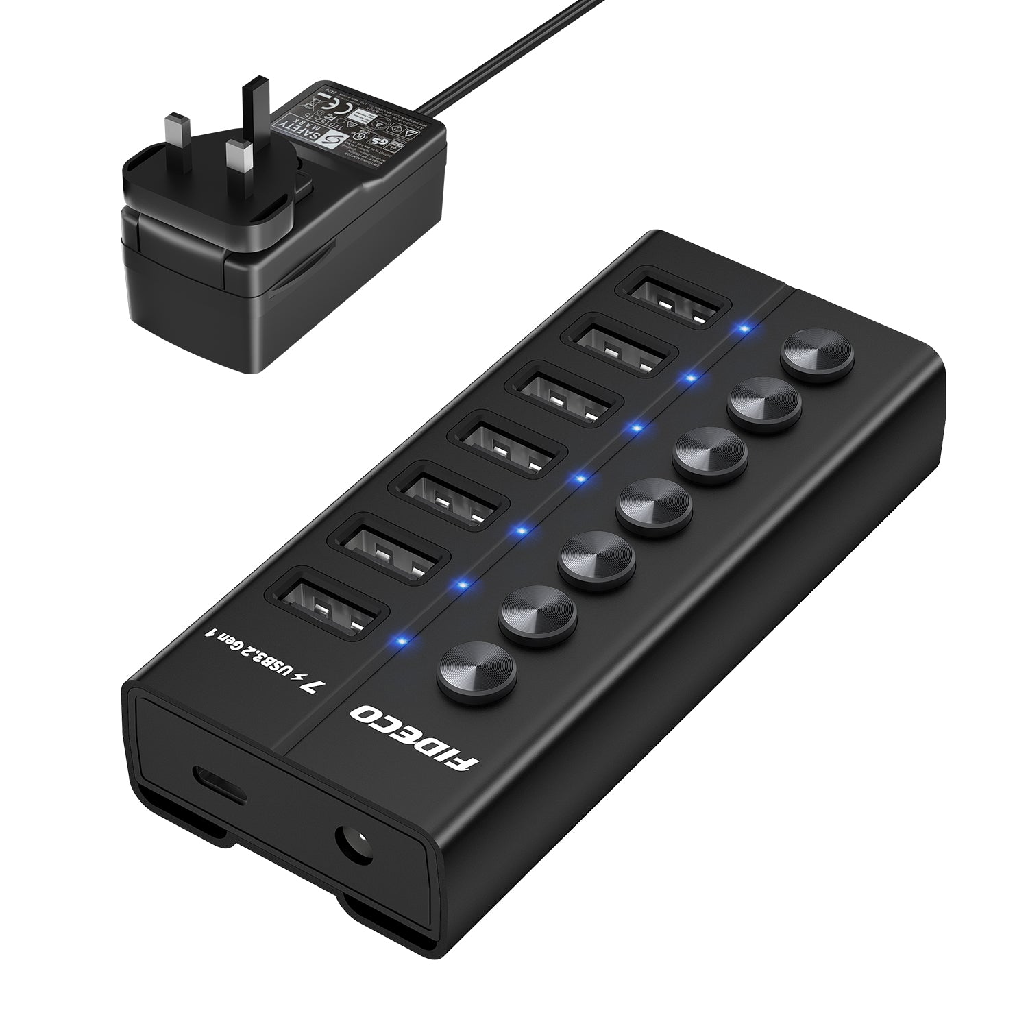 FIDECO USB splitter is equipped with 12V/2A power adapter, and can support simultaneous connection of total 7 devices.