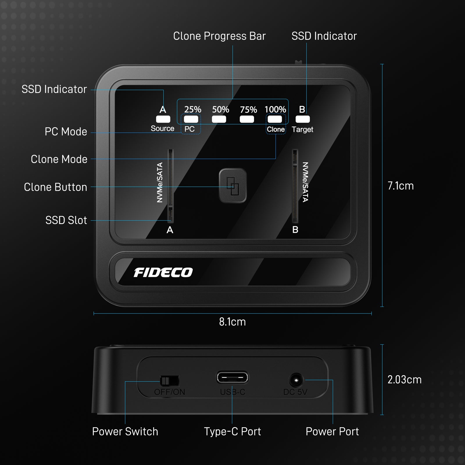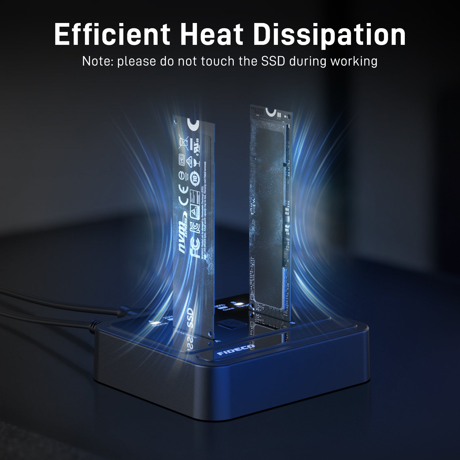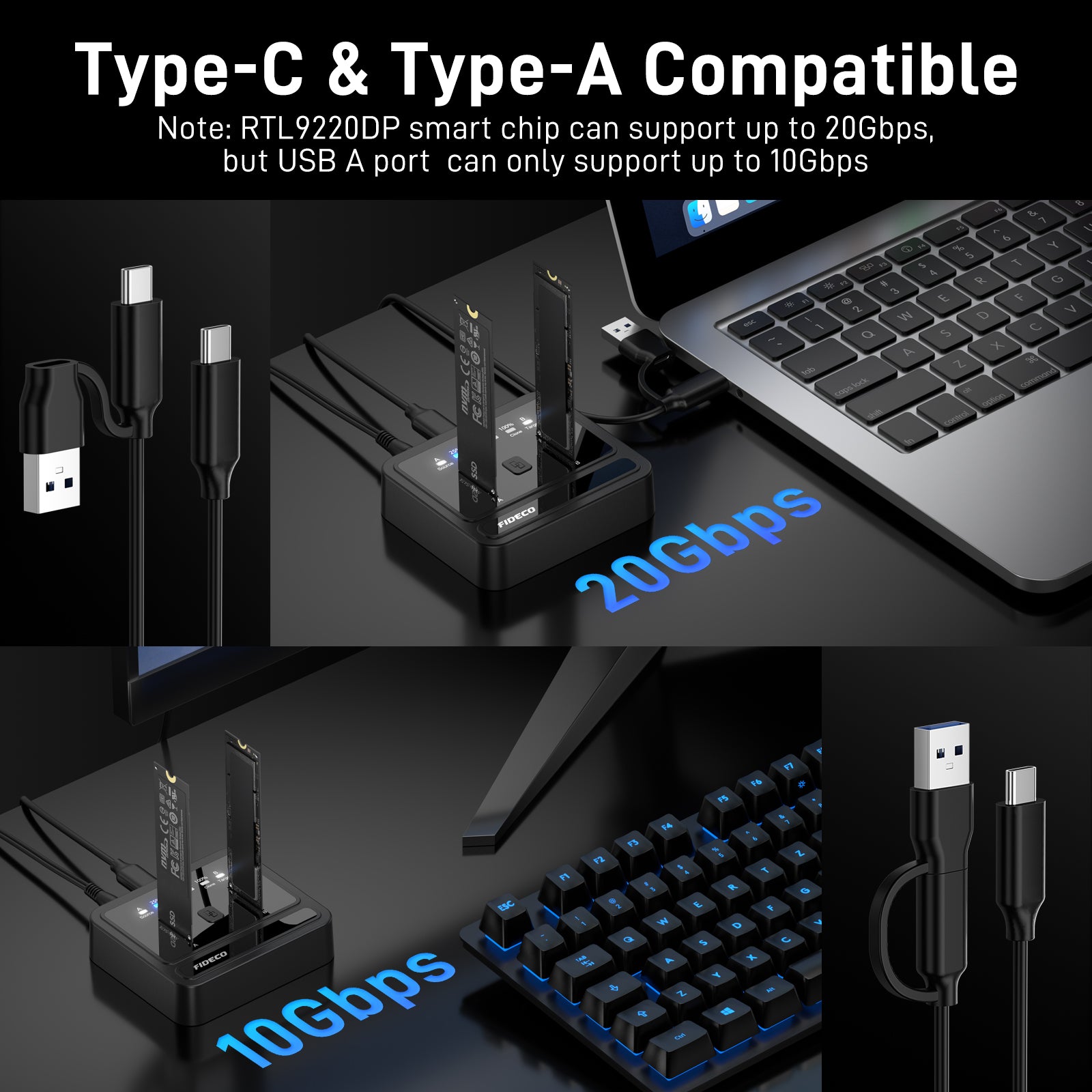 FIDECO NVMe SATA SSD Docking Station can support M.2 PCIe NVMe SSD with M-Key or M+B Key and M.2 SATA SSD with M+B Key. The supported M.2 SSD sizes are 2230/2242/2260/2280/22110. Just one dual NVMe SATA SSD dock can meet your needs of using different sizes of SSDs.