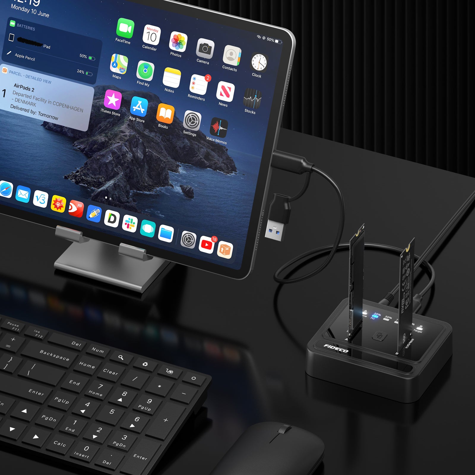 FIDECO Dual-Bay NVMe SATA Docking Station, Lay-Flat External Hard Drive Docking Station for M2 SSD Support Offline Clone Function and Tool-Free Installation.