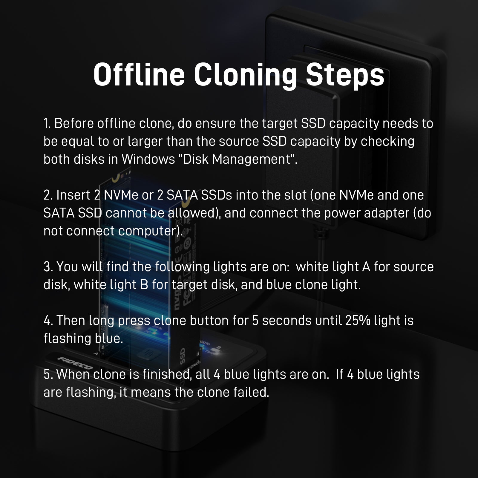 2. For Standalone Duplication: Plug the target SSD into Slot B and plug the source SSD into slot A (the end were the power adapter connects). Target SSD capacity must be Larger than the Source SSD capacity. Press and hold the button for 3-5 seconds to begin the clone process. LED’s on the front top of the dock indicate clone progress – 25%, 50%, 75% and 100%.