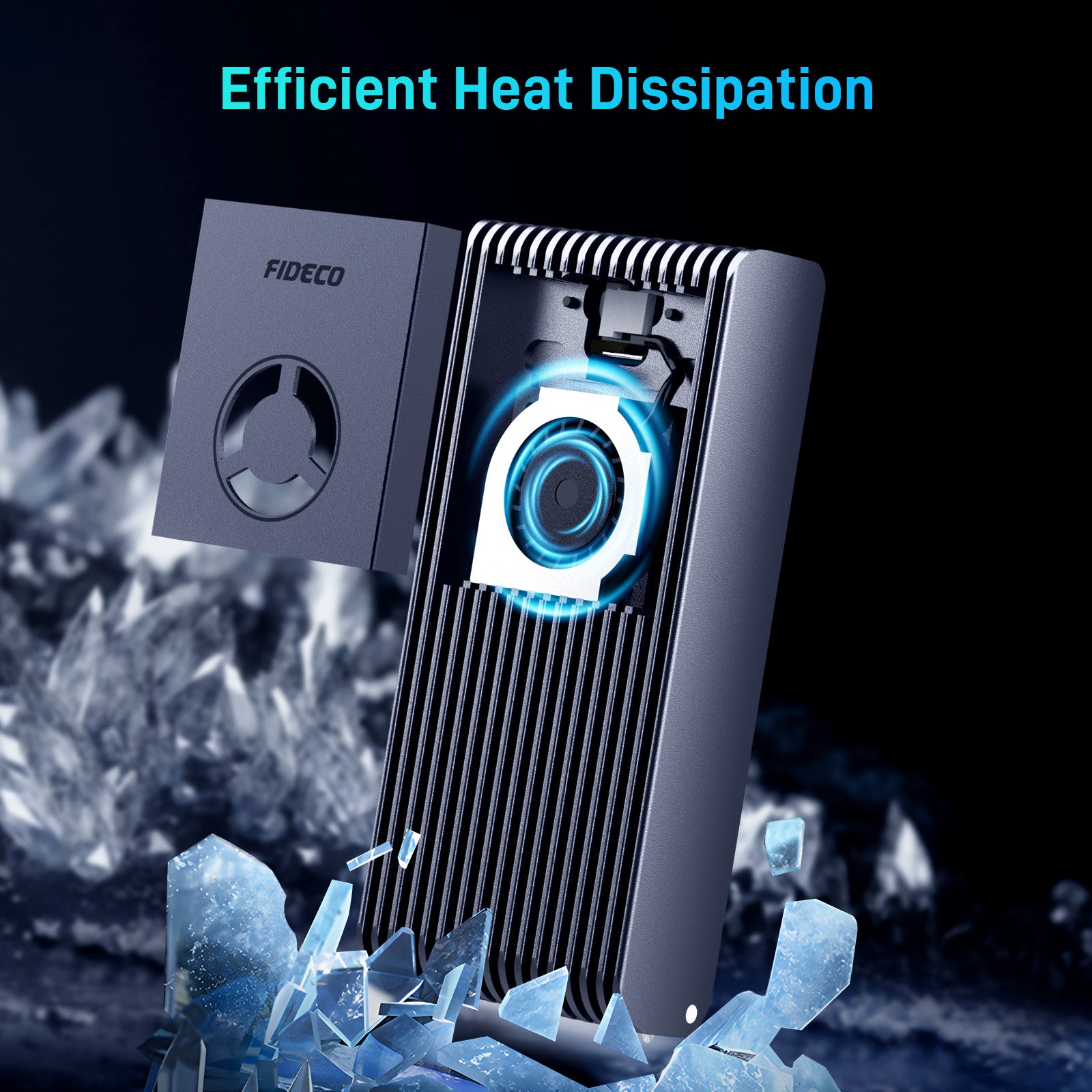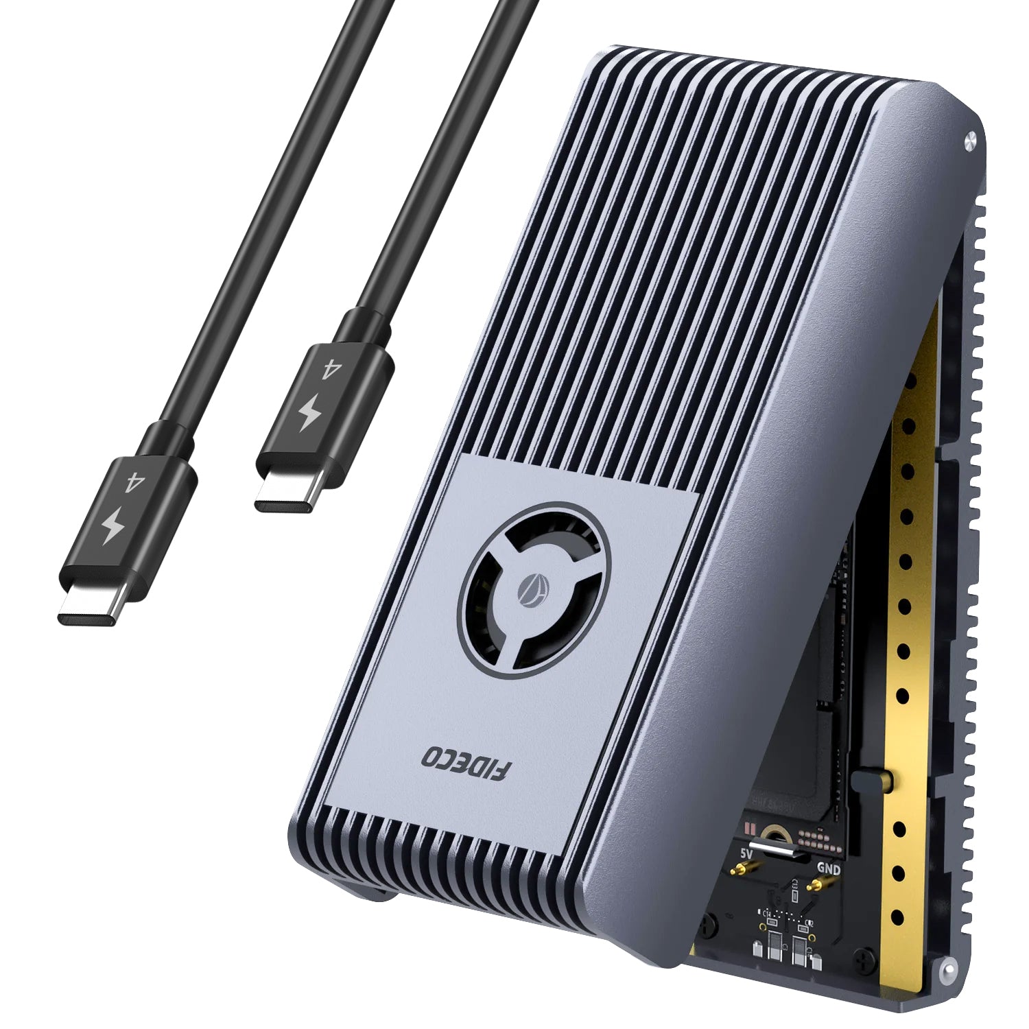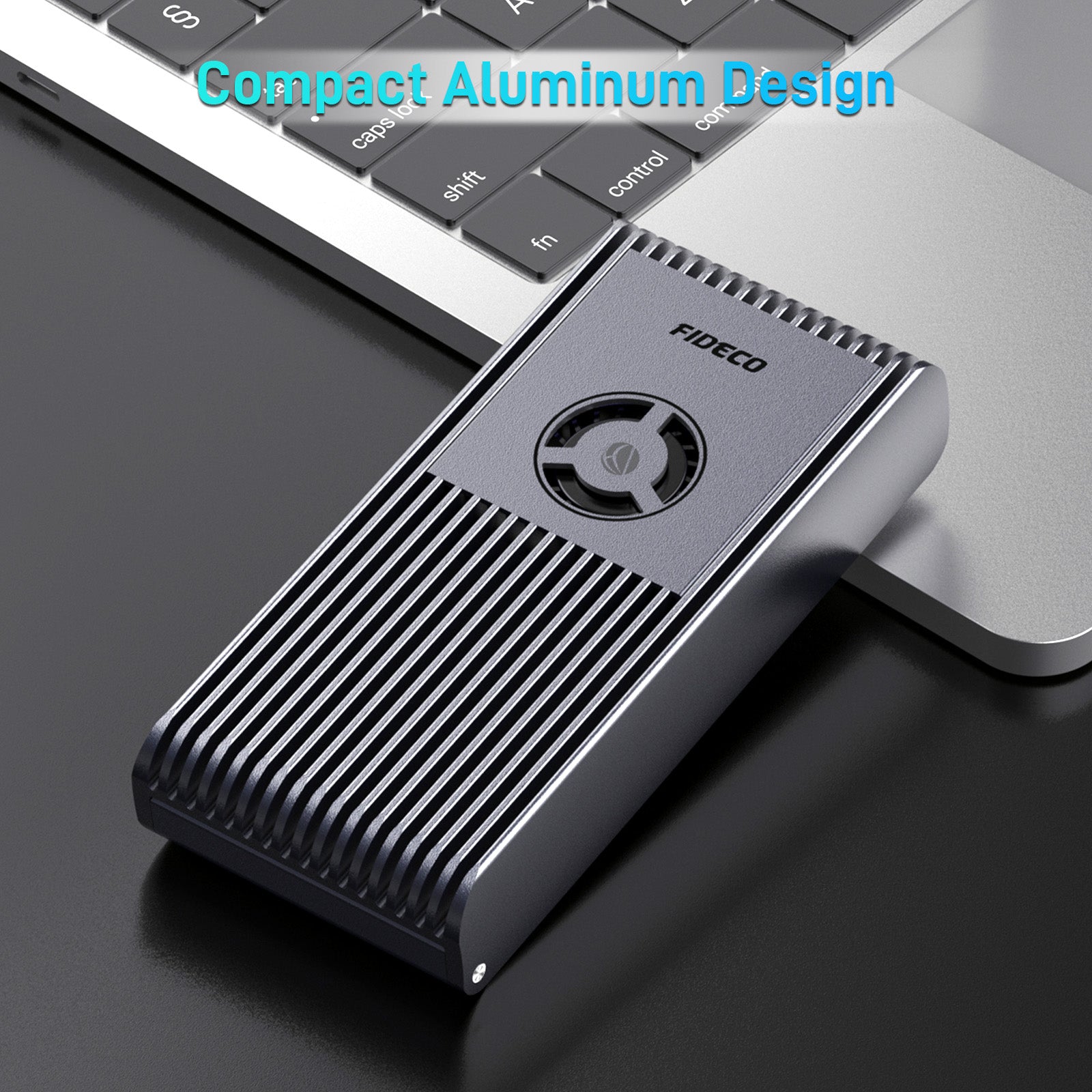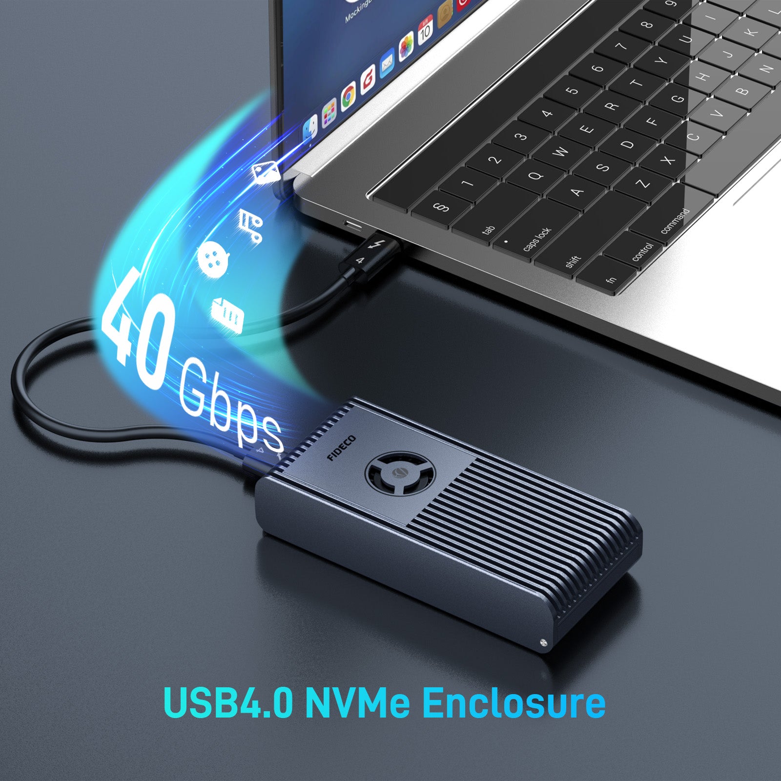 FIDECO USB 4 thunderbolt 3 external m2 nvme enclosure is designed for users seeking high-speed data transfer and portability, offering a more flexible storage solution than traditional internal storage. It enables SSDs to function as external drives, with plug-and-play. It is for sandwich design with cooling fan for heat dissipation.